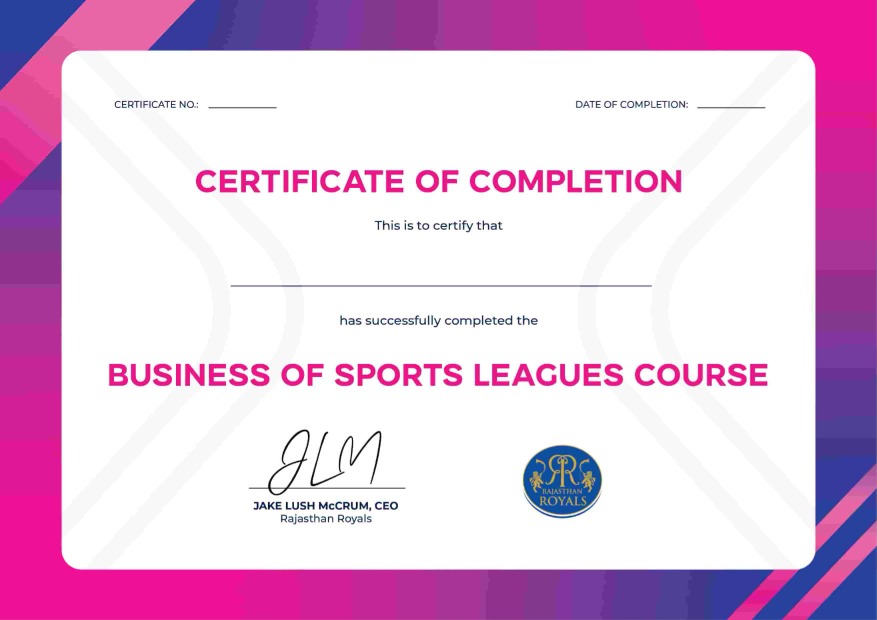 This Certificate is to certify that the student has successfully completed the Business of Sports Leagues Course by Rajasthan Royals.