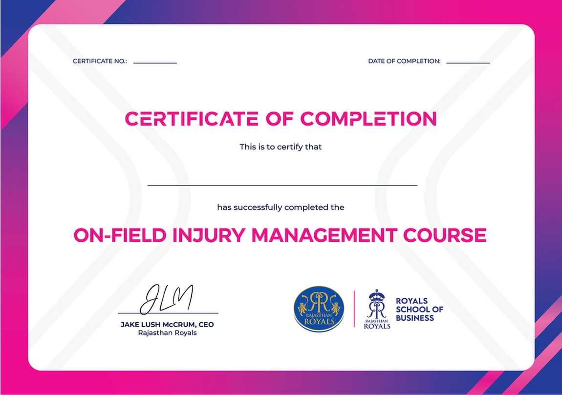 This Certificate is to certify that the student has successfully completed the On-Field Injury Management Course by Rajasthan Royals.